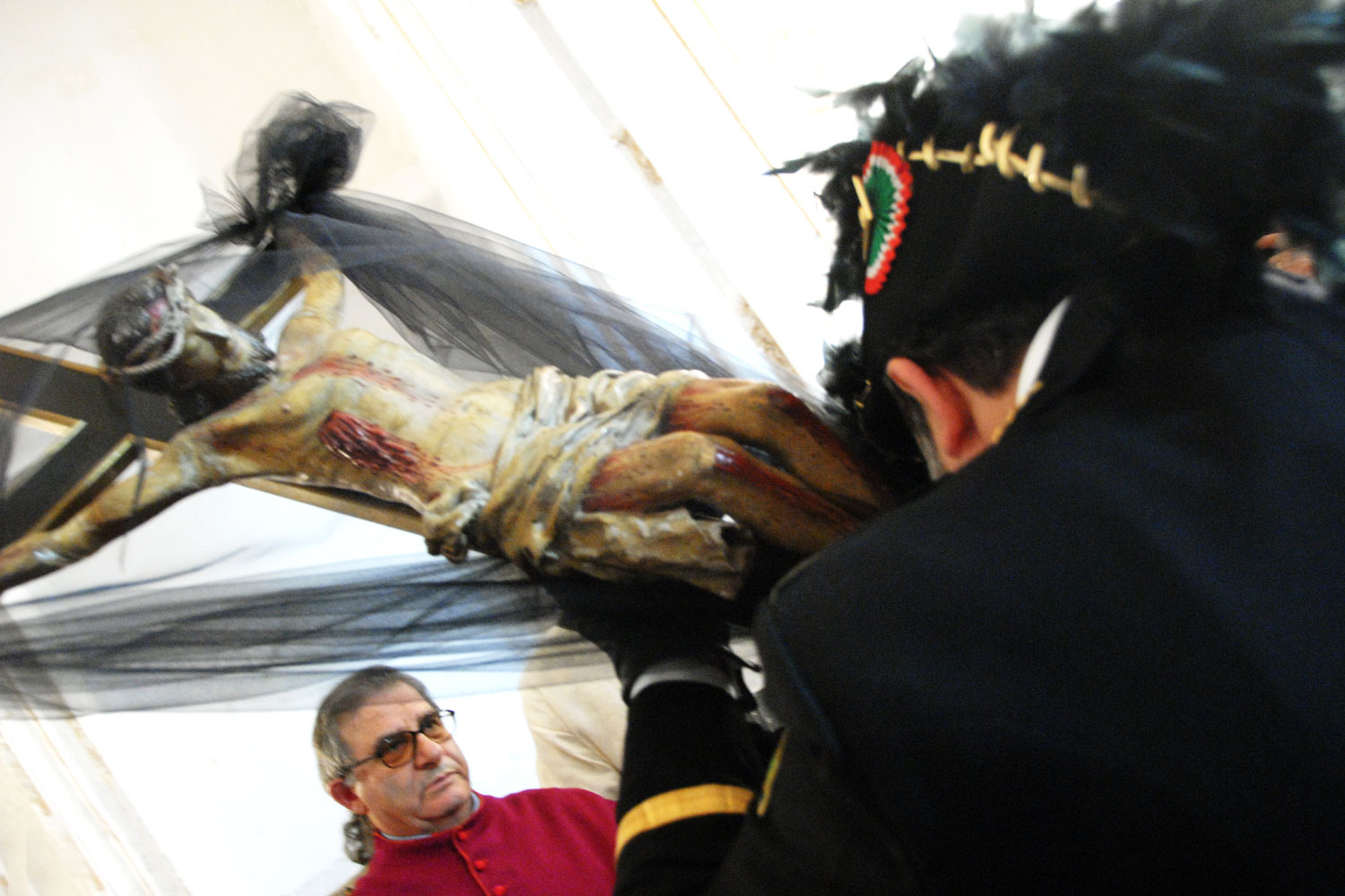 Nella prima parte del rituale, la Maestranza guidata dal capitano che regge il Crocifisso velato, esce dall'ex collegio gesuitico e si reca in processione penitenziale alla volta della cattedrale.